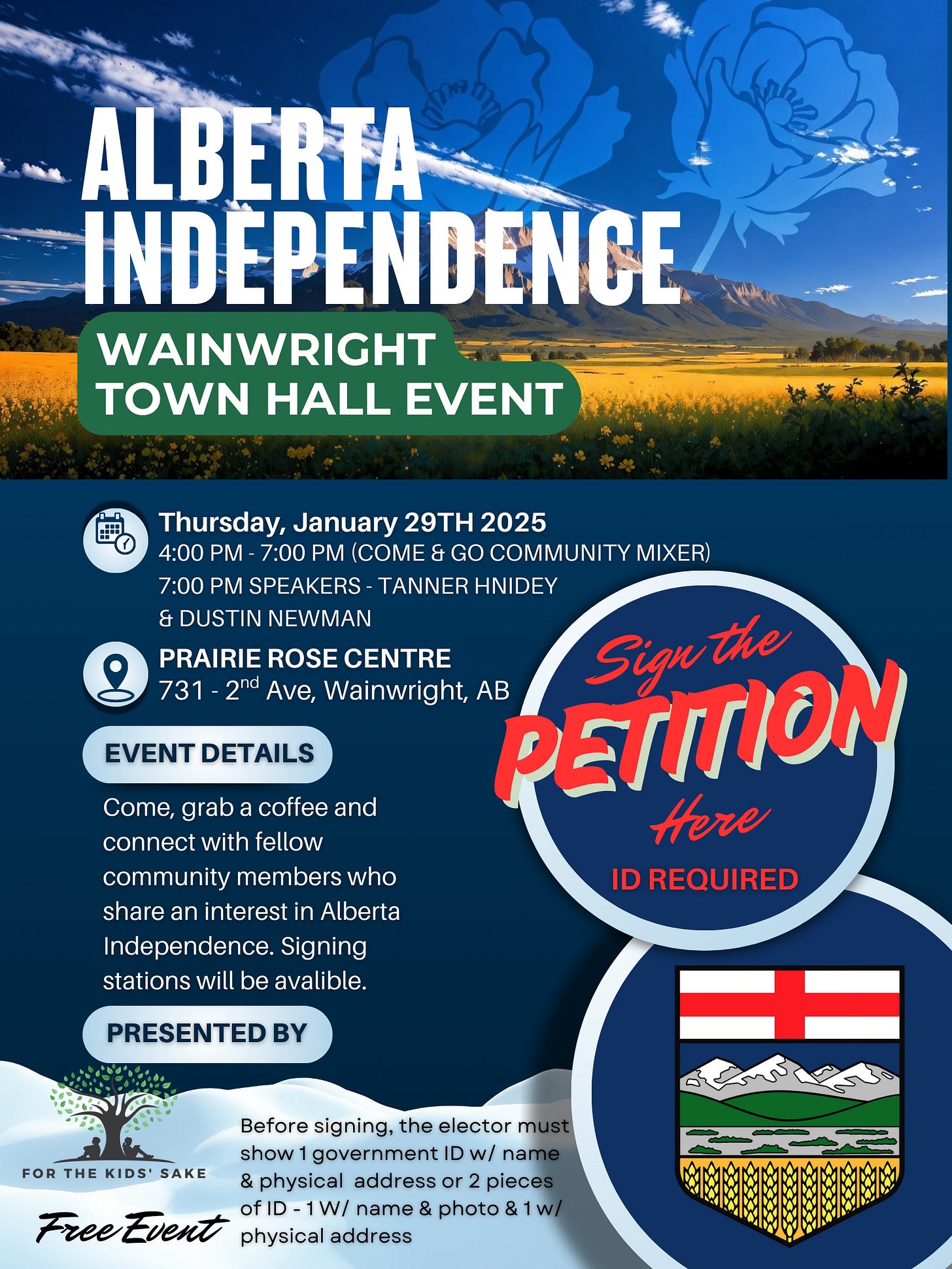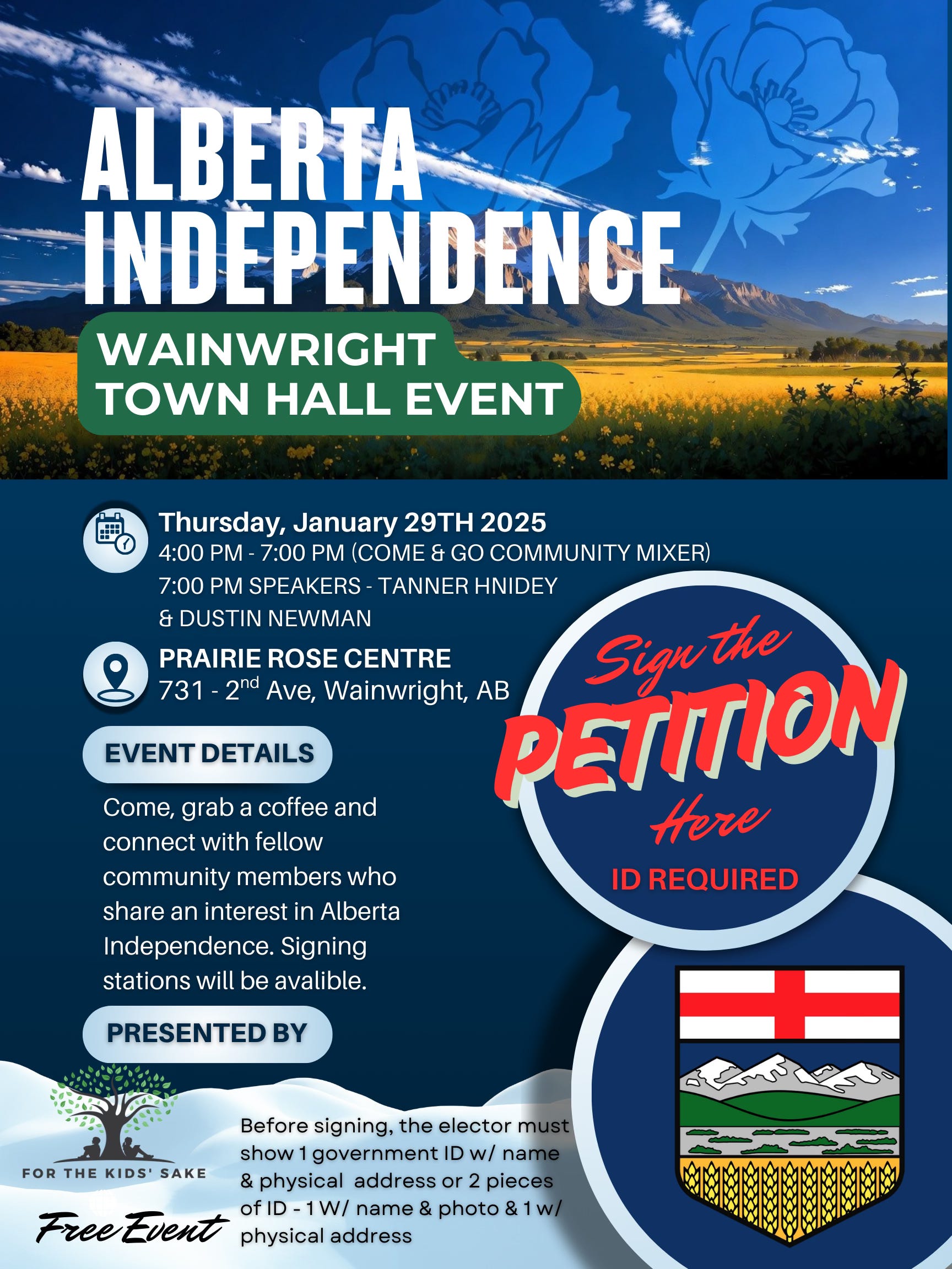The doors will open at 4:00 pm for you to stop by and connect with community members, including some of our dedicated “For the Kids’ Sake” members who have been actively involved in this movement. We’ll be available to help answer any questions you might have. You’re also welcome to come anytime throughout the evening to sign the petition, as canvassers will be on site to assist. At 7:00 pm, guest speakers Tanner Hnidey and Dustin Newman will present on Alberta Independence.